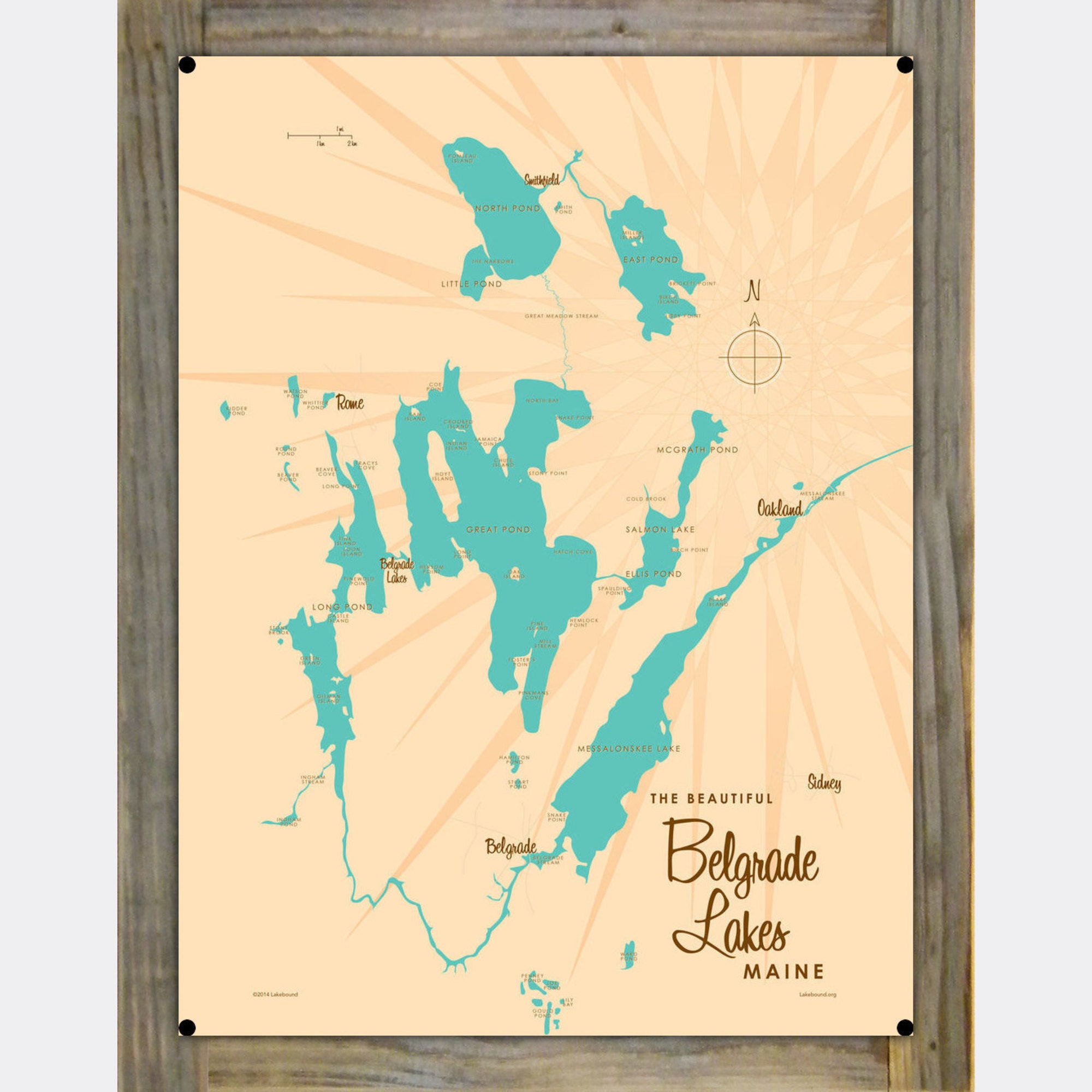 Belgrade Lakes Maine, Wood Mounted Metal Sign Map Art – Lakebound®